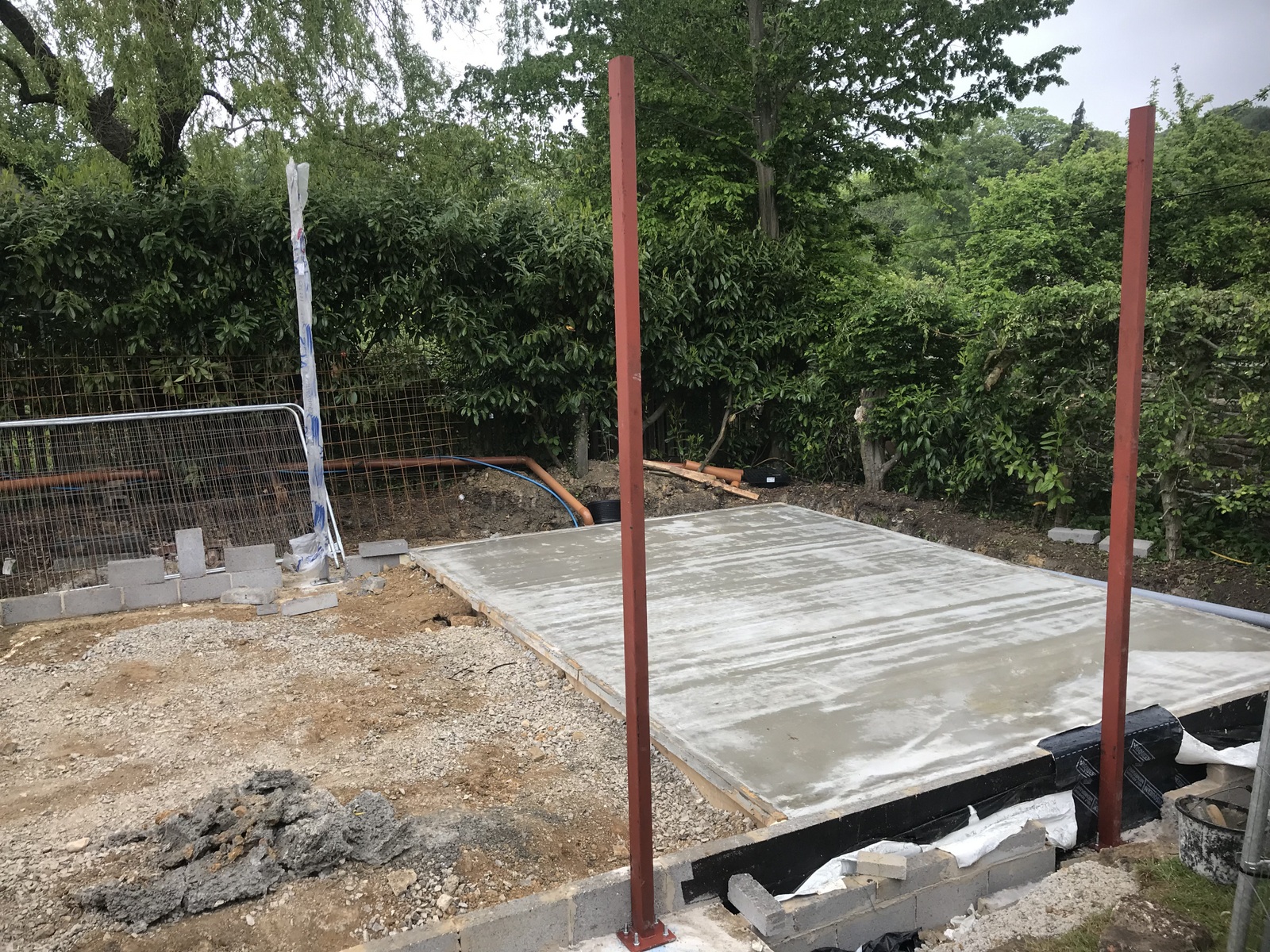 The piles went in on the South side ~ 4m deep .. and fortunately hit good enough ground. Beams and slabs are being made on-site (steel frames, shuttering and more concrete) to join them to the current foundations. We have also laid the lower slab to the garage. It looks like we’ve got past the problems of the foundations. I’ve appreciated the house being on a (15o) slope has added hugely to the foundations cost in complexity and process.